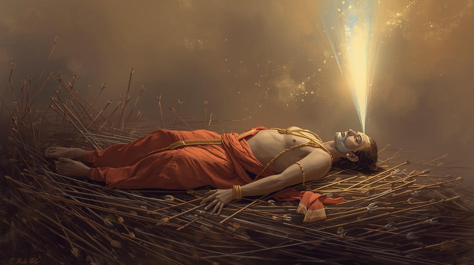ಸ್ಥಿತಿ: ಭೀಷ್ಮರು ಶರಶಯ್ಯೆಯ ಮೇಲೆ ಮಲಗಿ, ತಾವು ಇಚ್ಛಿಸಿದಾಗ ಮರಣವನ್ನು ಅಪ್ಪಲು ಕಾಯುತ್ತಿದ್ದಾರೆ (ಇಚ್ಛಾಮರಣ).